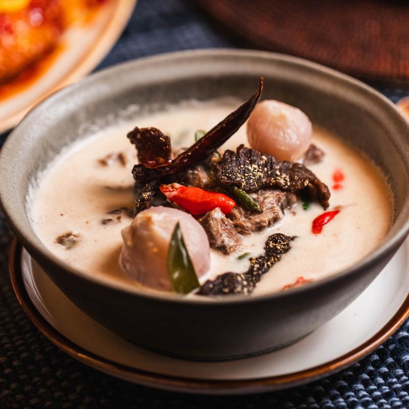 Braised beef shank in coconut curry with shallot, lime leaf, galangal powder, and house-made beef jerky.