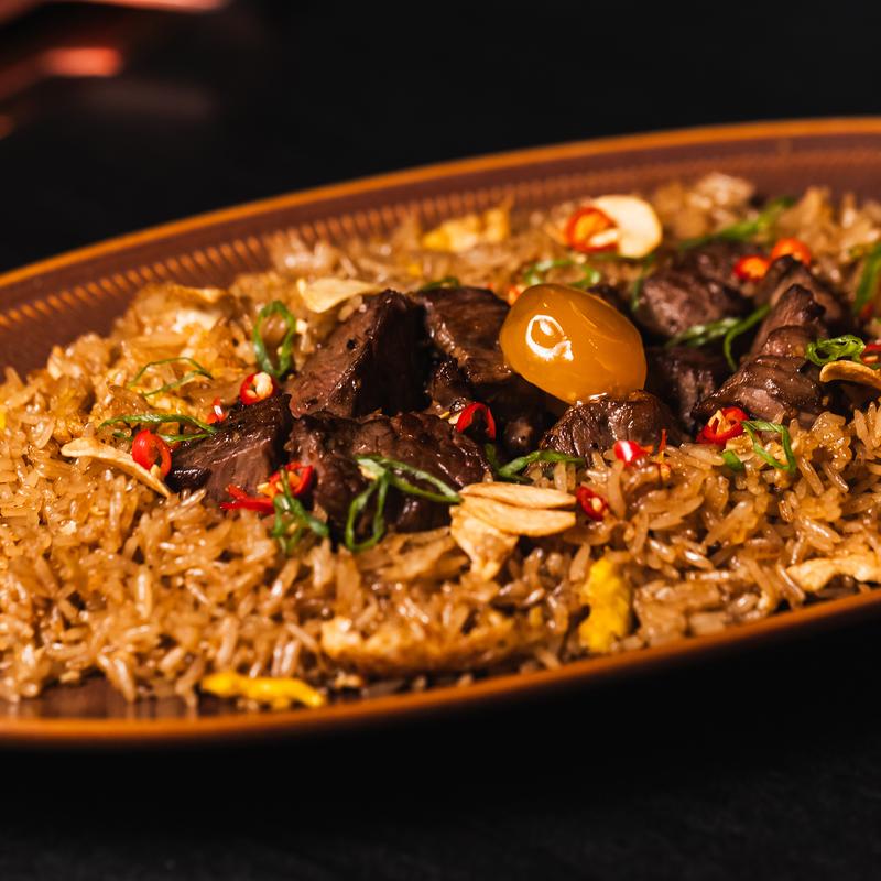 Stir-fried jasmine rice with american wagyu and egg. Garnished with cured egg yolk, garlic chips, chili, and scallions.