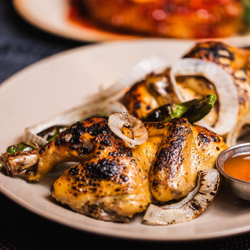 Juicy grilled Cornish hen with famous “khao suan kwang” marinade, served with sweet chili sauce.