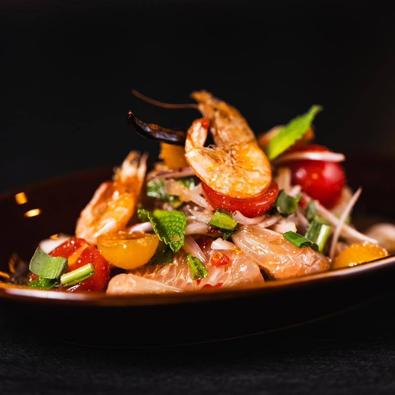 Pomelo, crispy school prawn, tomatoes, shallot, roasted rice, and mint with pla-ra dressing.