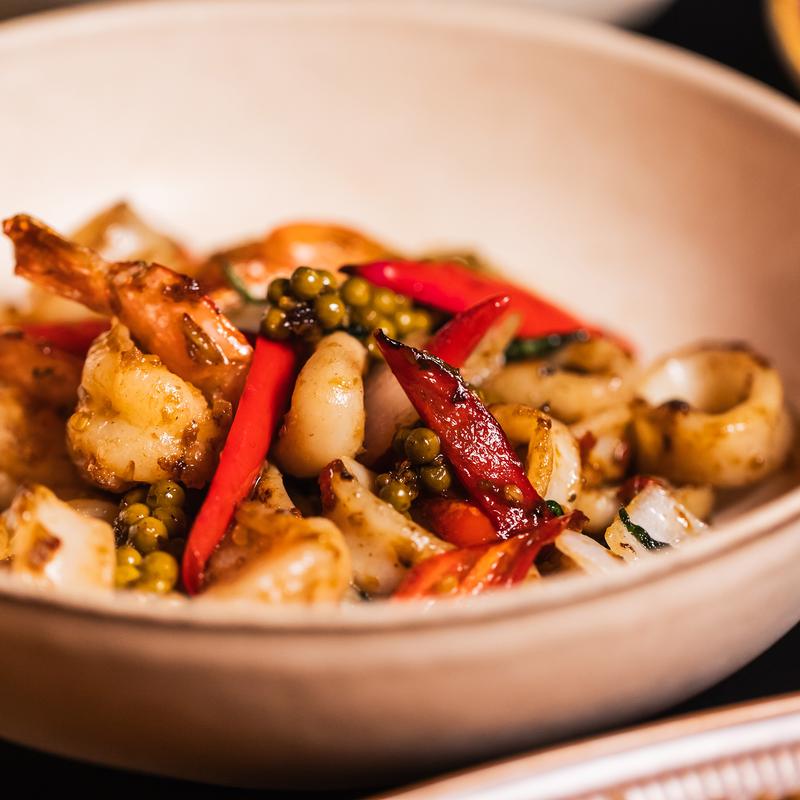 Wok-tossed various seafood with chili, onion, young peppercorns, and Thai herbs.
