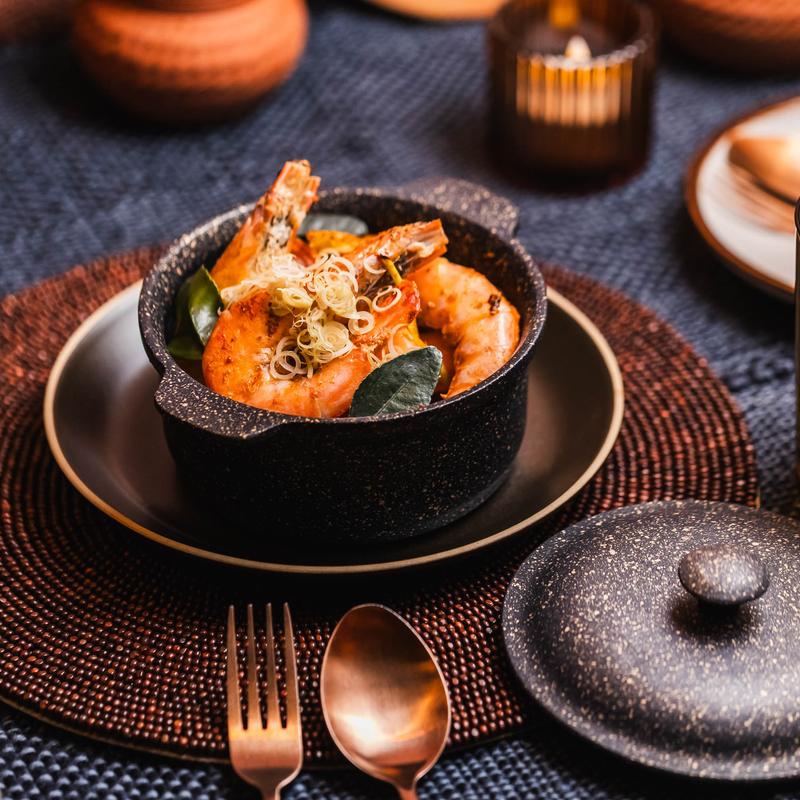 Baked white prawns with Thai herbs and sea salt, served with spicy-tangy seafood sauce.